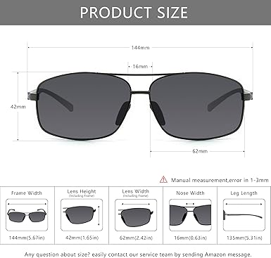 - Sunglasses Dimensions: Lens Height : 42 mm (1.65 inches) | Lens Width: 62 mm (2.42 inches) | Nose Bridge: 16 mm (0.63 inches) | Temple Length: 135 mm (5.31 inches) | Frame Length: 144 mm (5.67 inches), classic sunglasses are suitable for most face shape